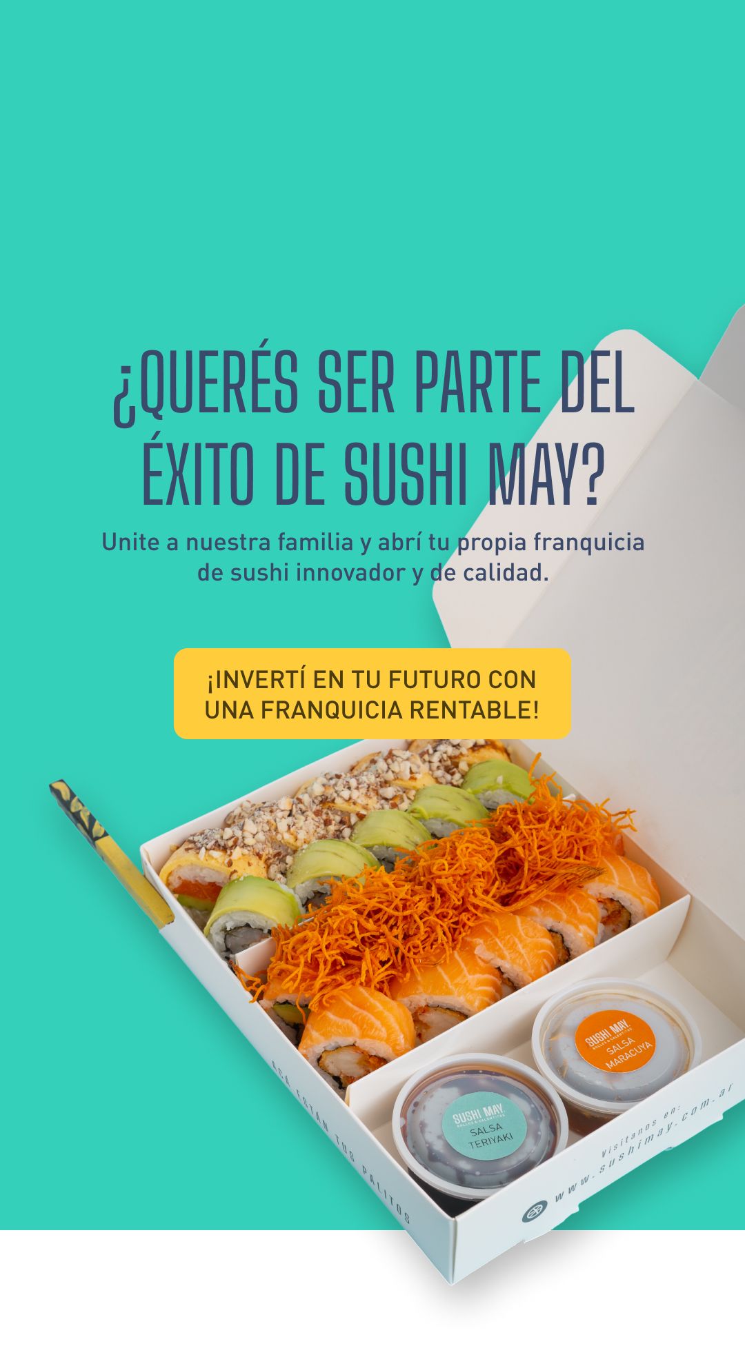 Sushi May es una empresa familiar apasionada por el sushi, con una trayectoria de éxito y un concepto innovador que ha conquistado Zona Oeste. Nuestro compromiso es ofrecerte productos de la más alta calidad, un servicio excepcional y una experiencia gastronómica única que nos diferencia de la competencia. Buscamos emprendedores apasionados por la gastronomía que quieran unirse a nuestra familia y llevar el sabor de Sushi MAY a nuevos rincones.